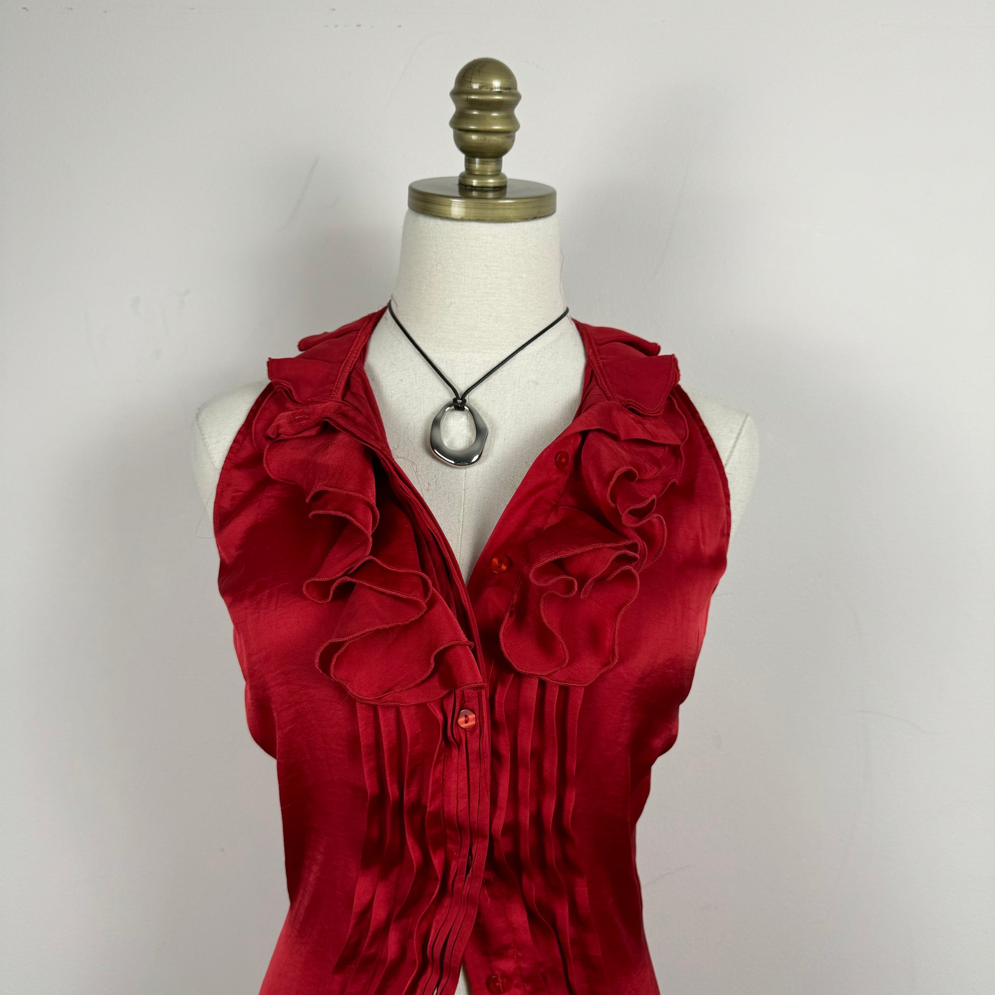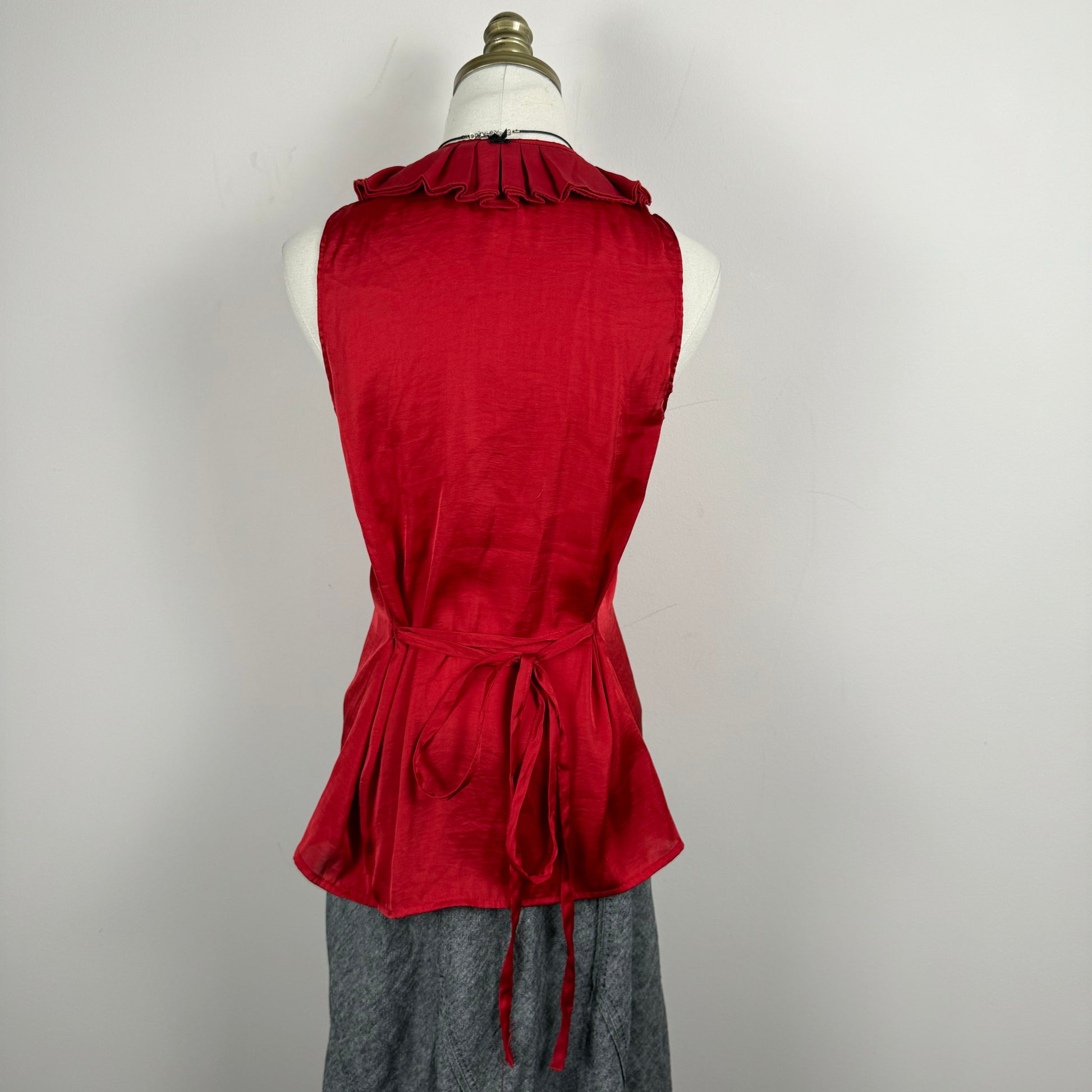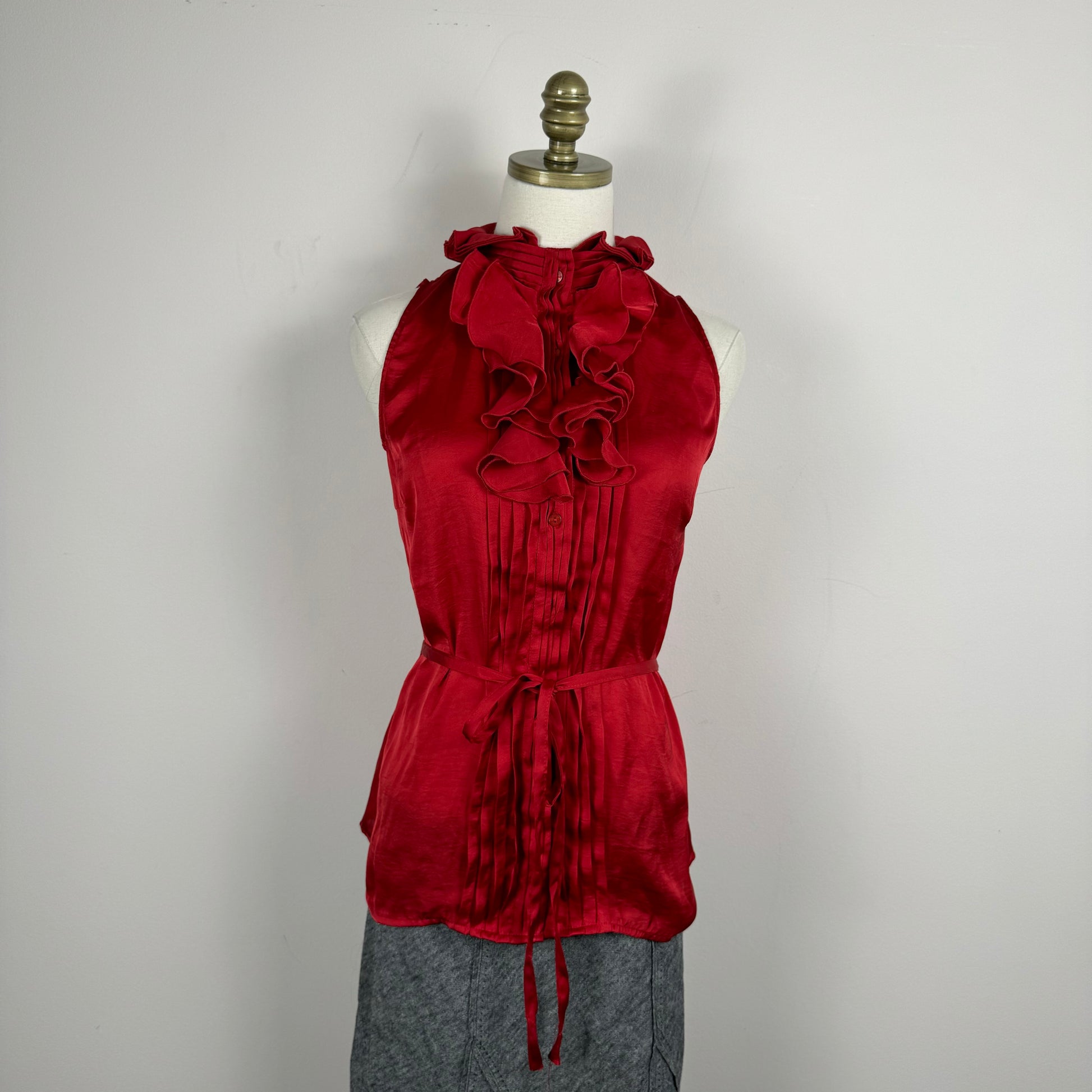 Details: Red sleeveless top in satin fabric with ruffled detailing, button-up closure, attached thin waistbelt, and the option to button up to a turtleneck.