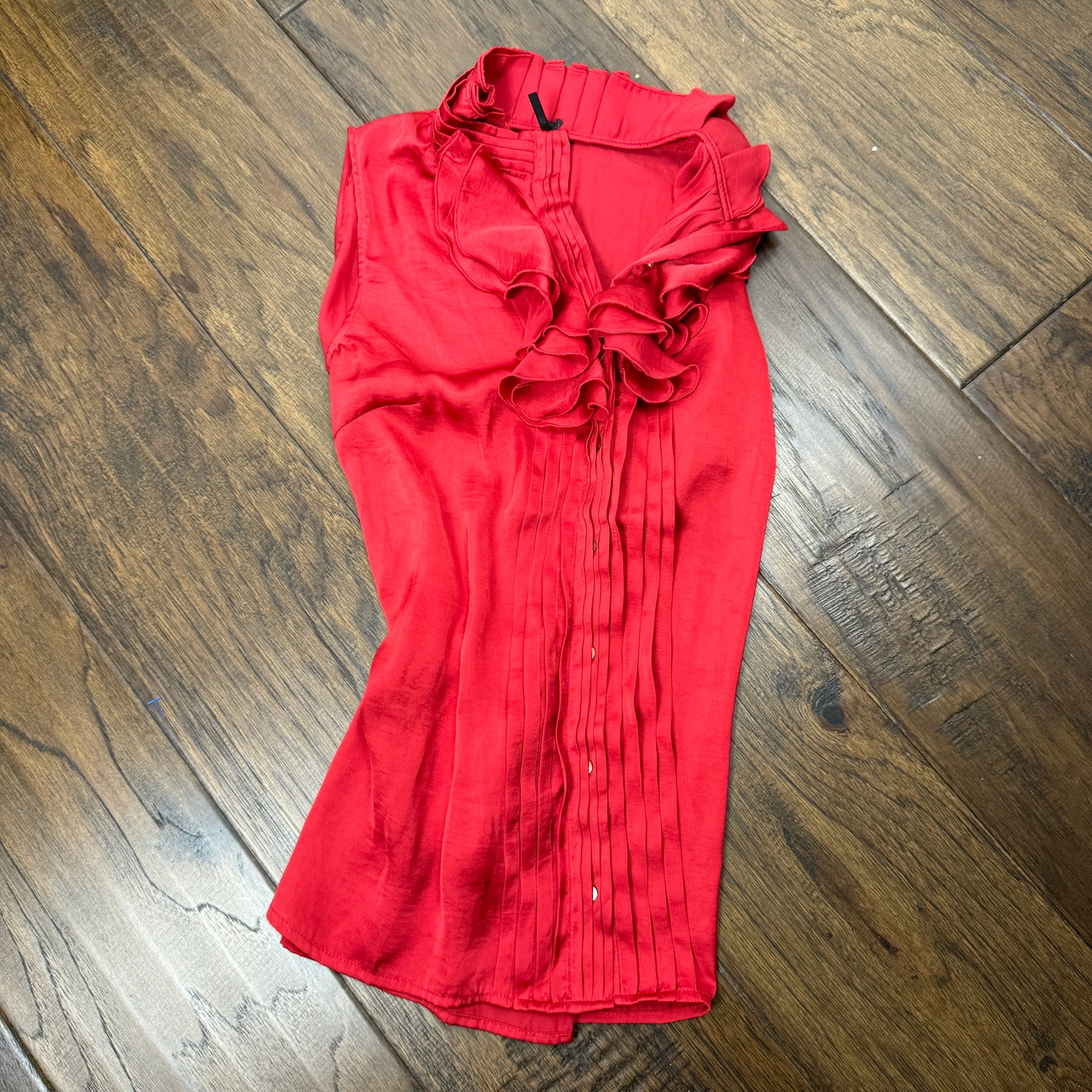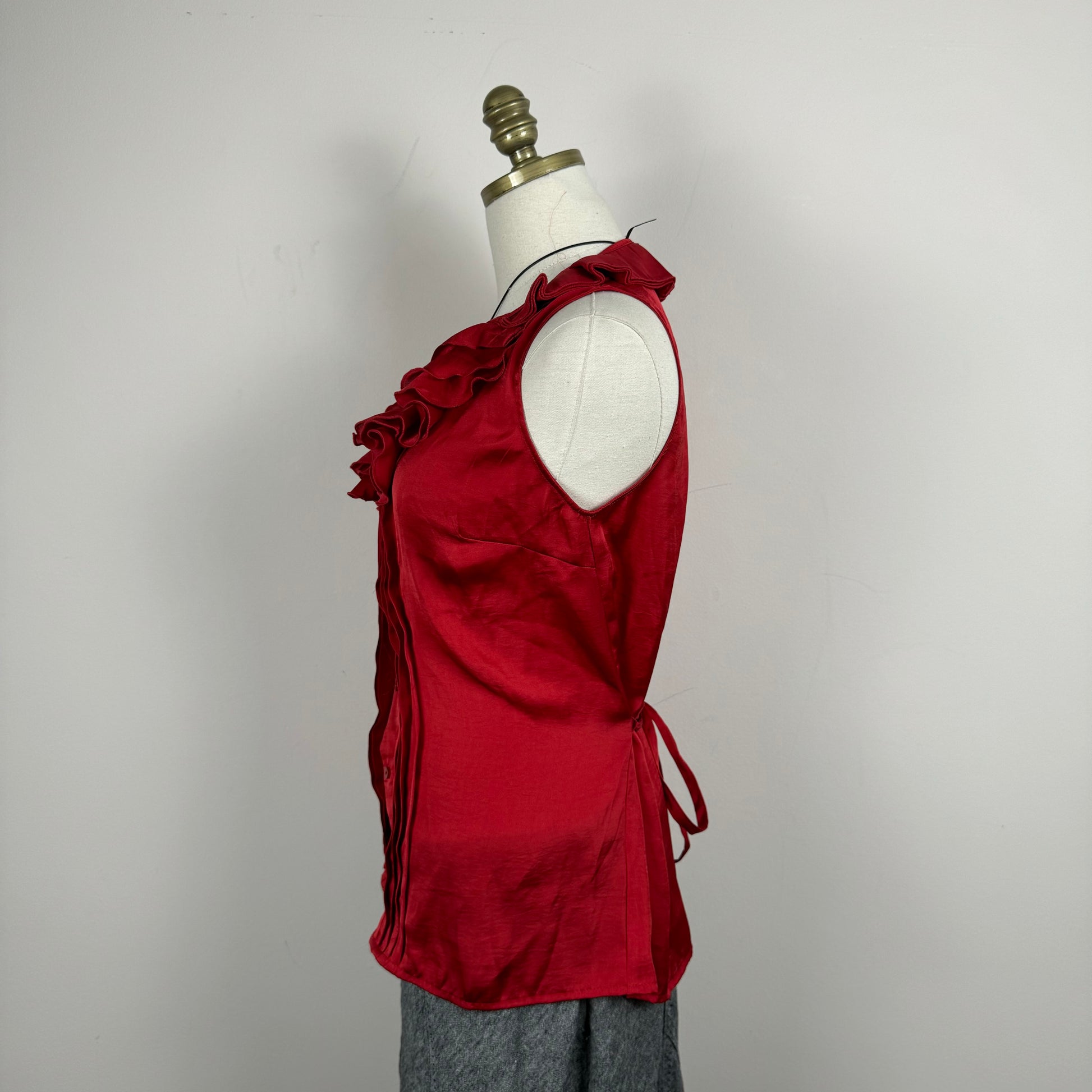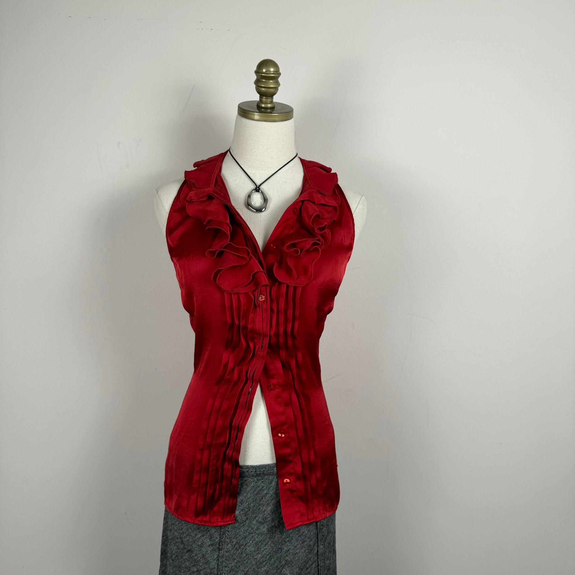 Details: Red sleeveless top in satin fabric with ruffled detailing, button-up closure, attached thin waistbelt, and the option to button up to a turtleneck.