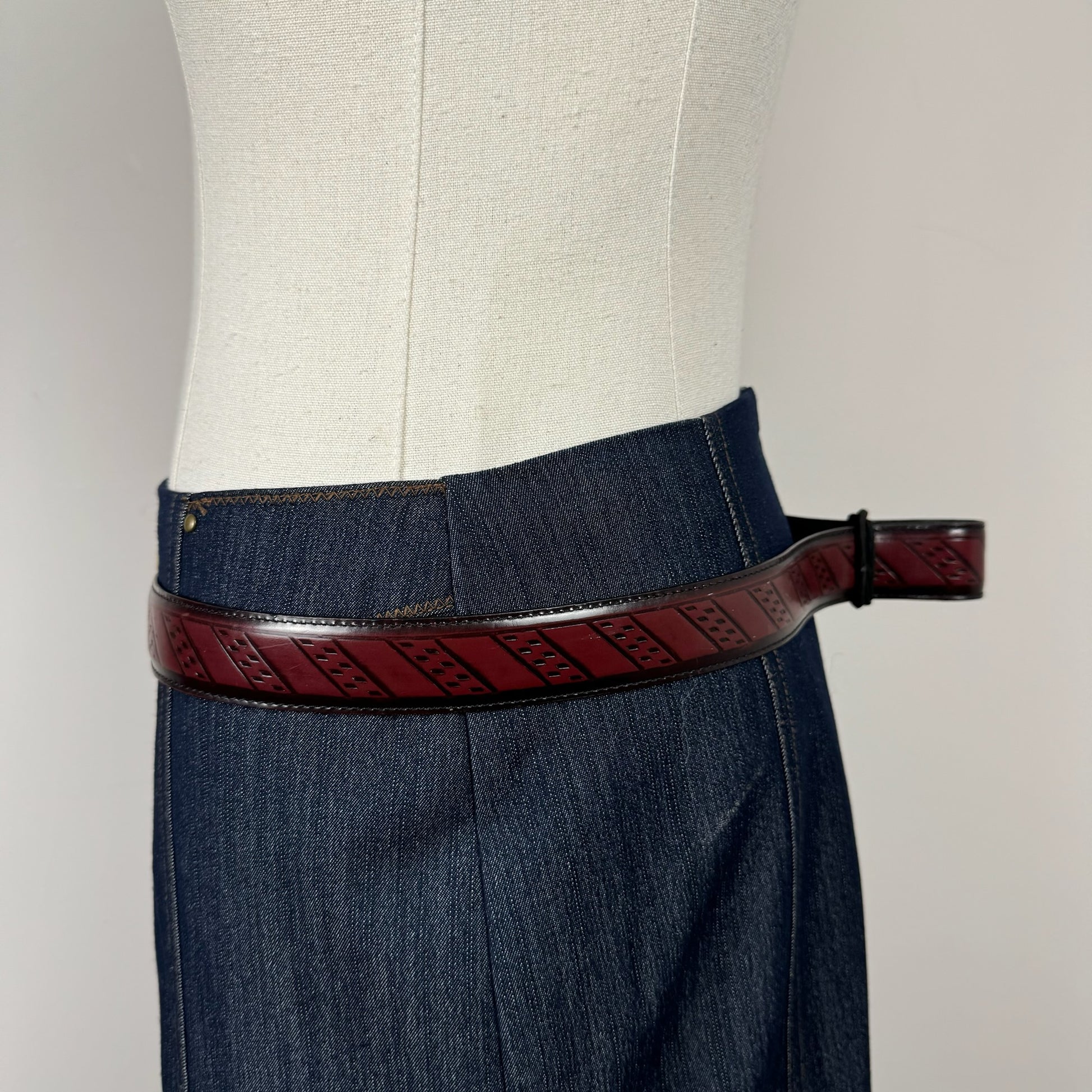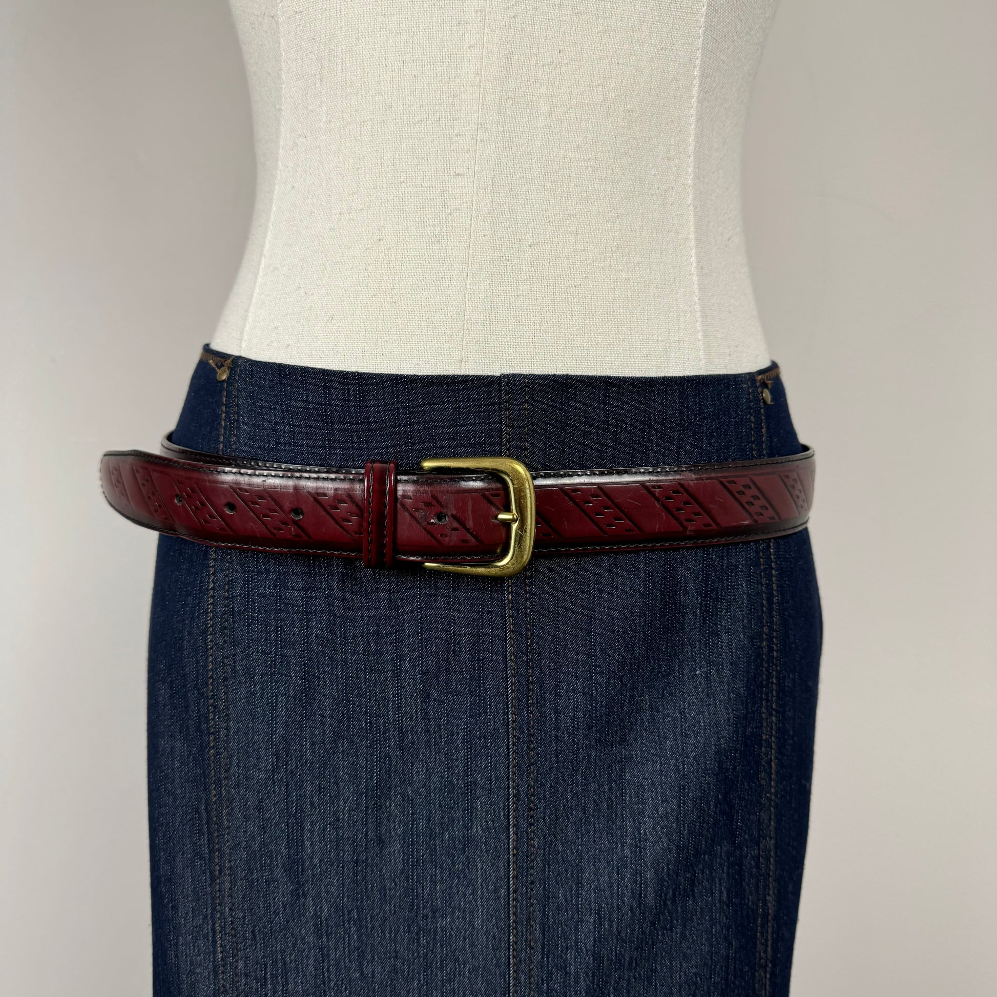 Details: Vintage western dark red and brown faux leather gold buckle belt.