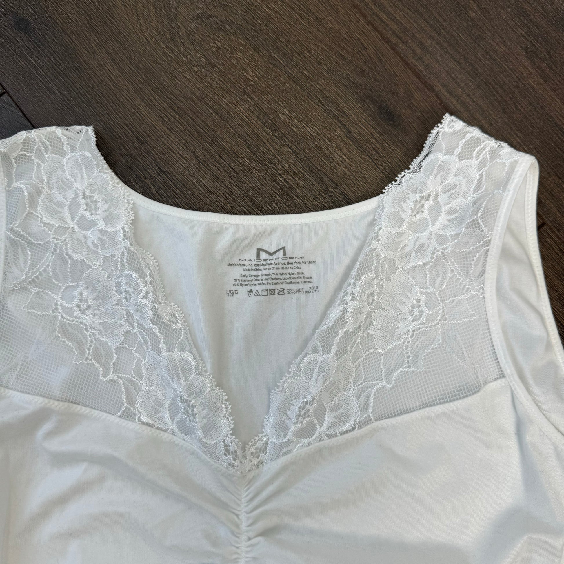 Details: White fitted tank top with lace trim details, body shaping.