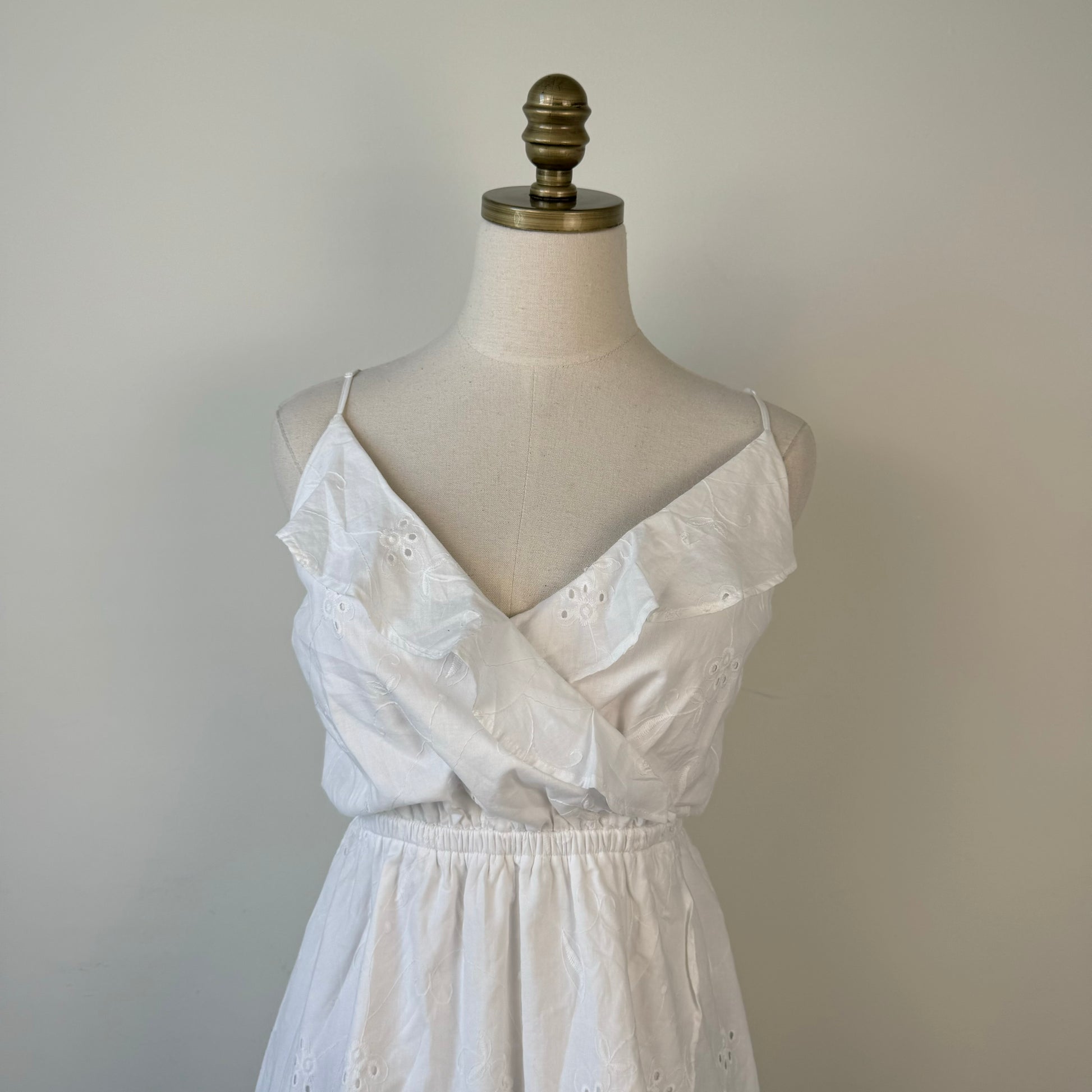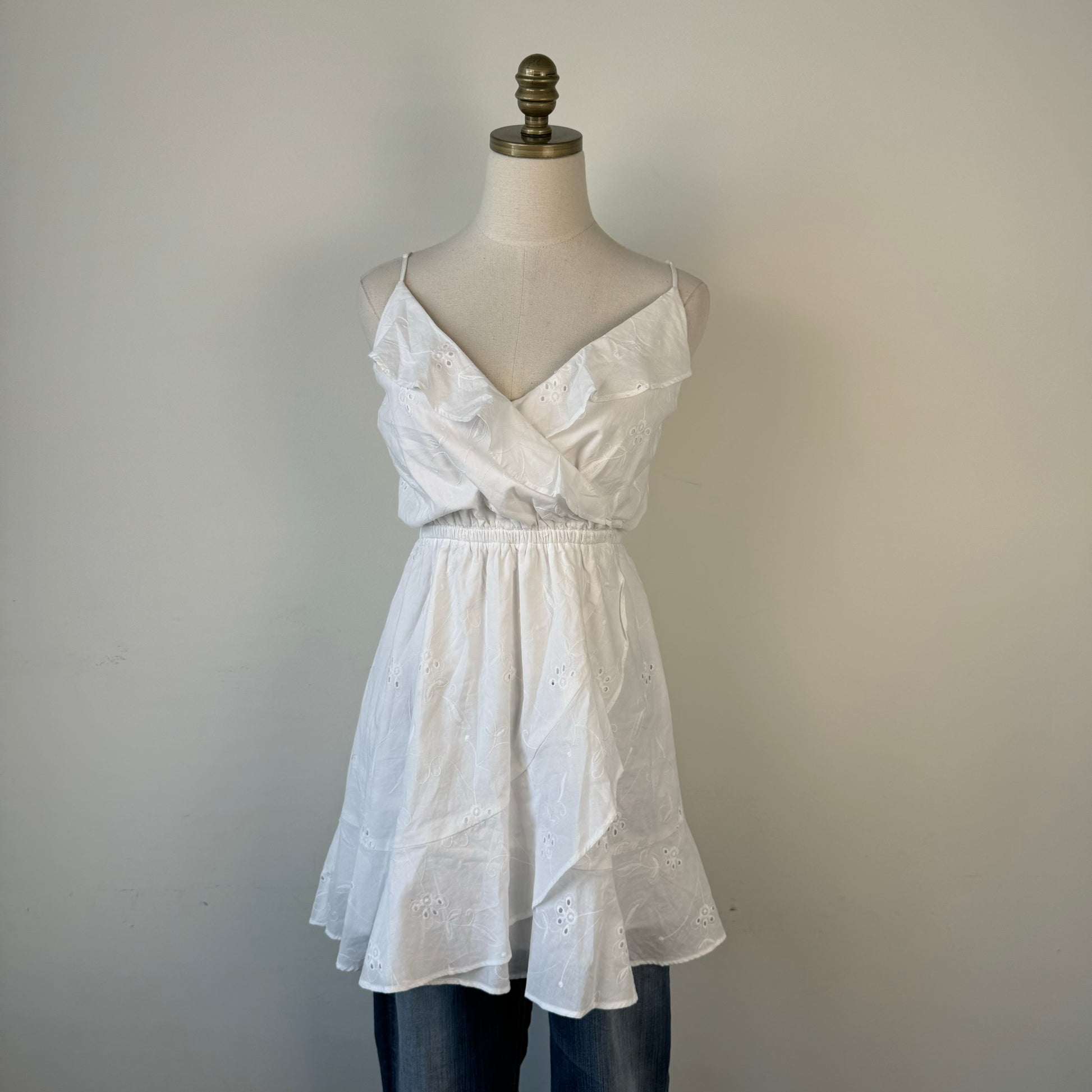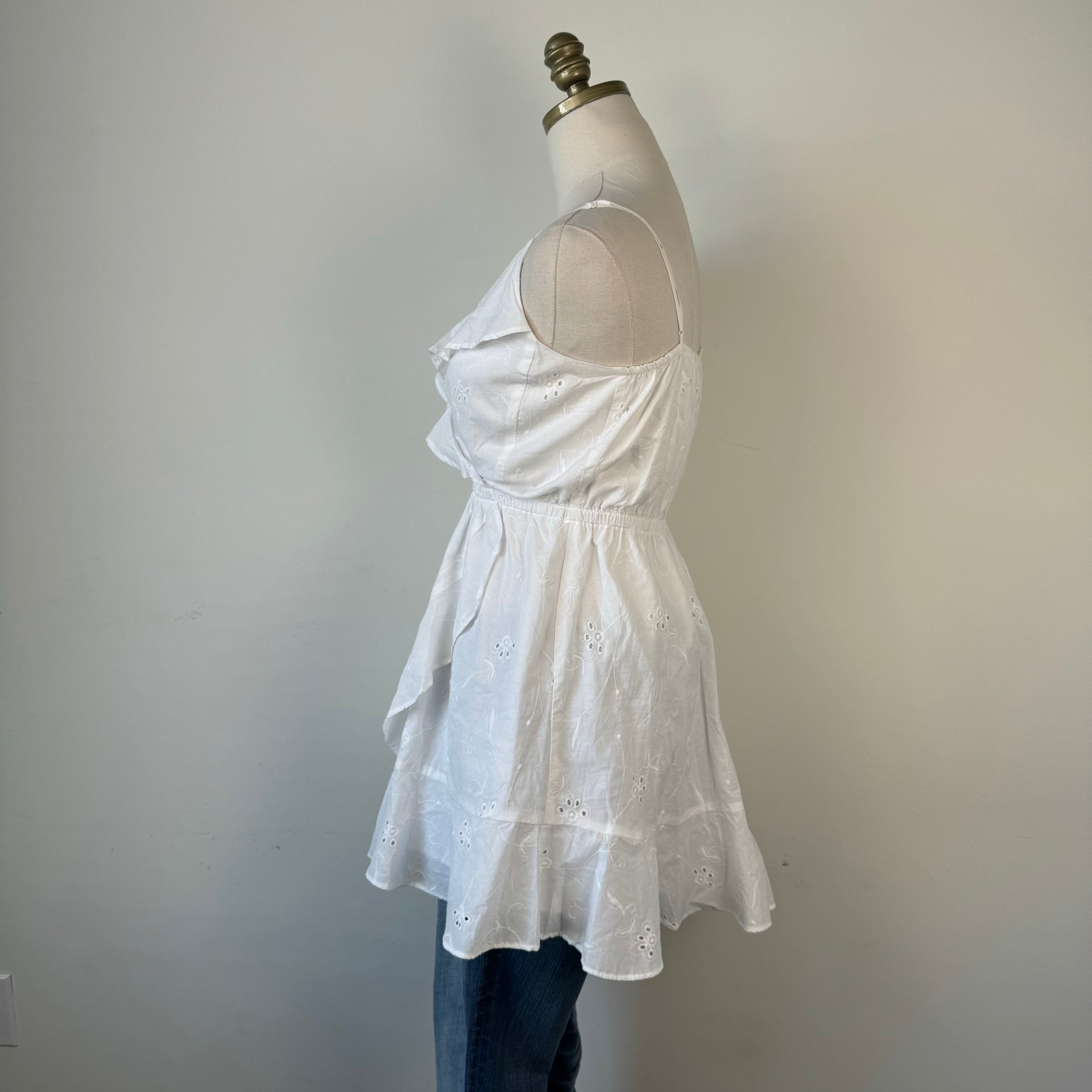 Details: White linen babydoll mini dress with ruffled details, can be styled as a long top.