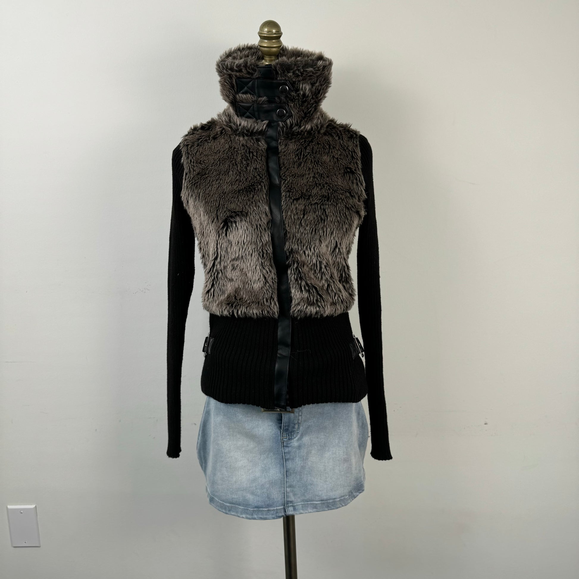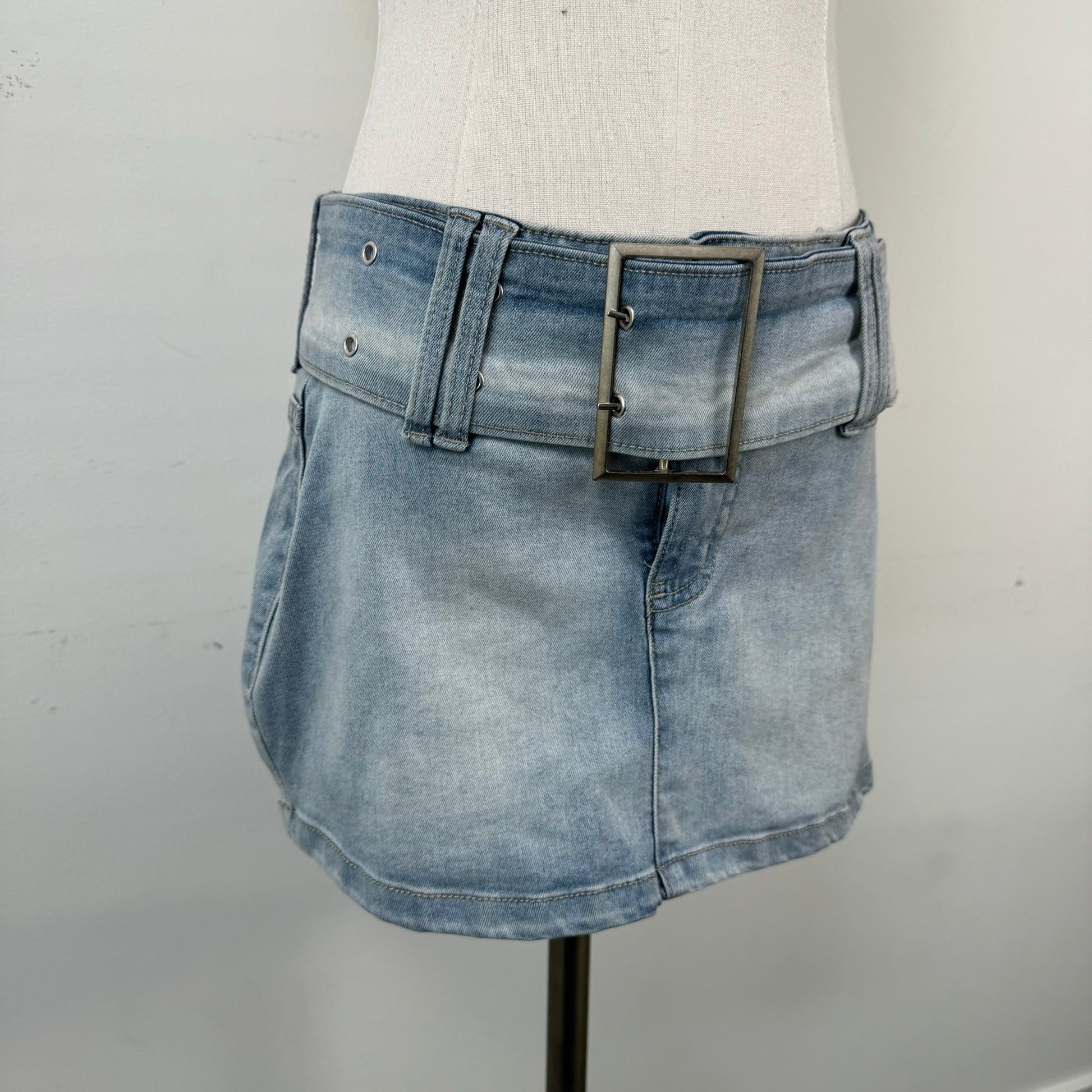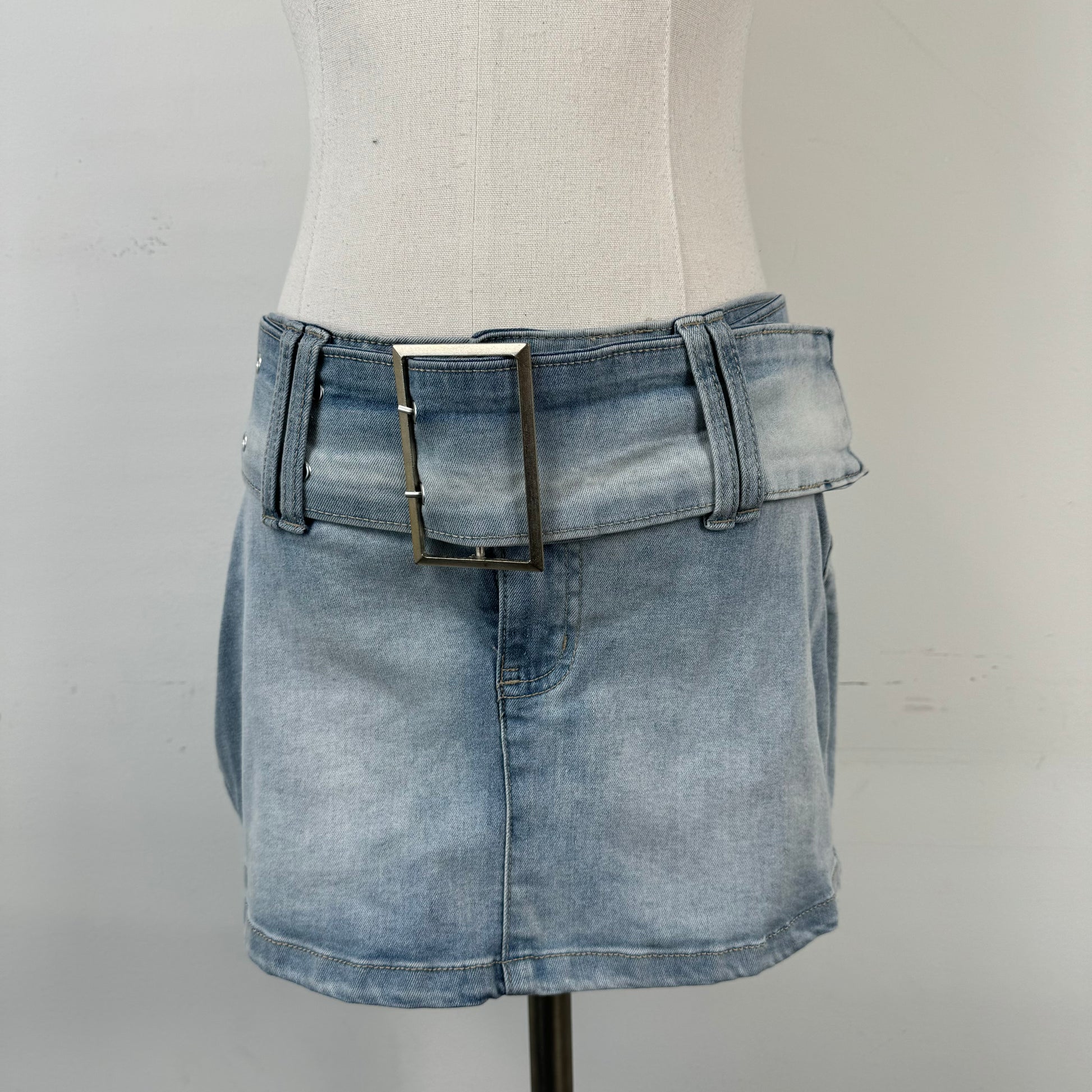 Details: Faded Y2K denim mini skirt with a wide waist belt and silver buckle.